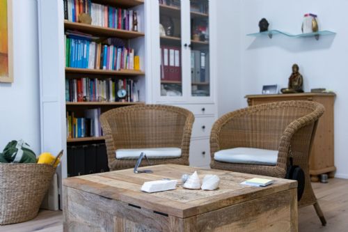 Blick in den freundlichen, lichtdurchfluteten Praxisraum mit gemütlicher Sitzecke.