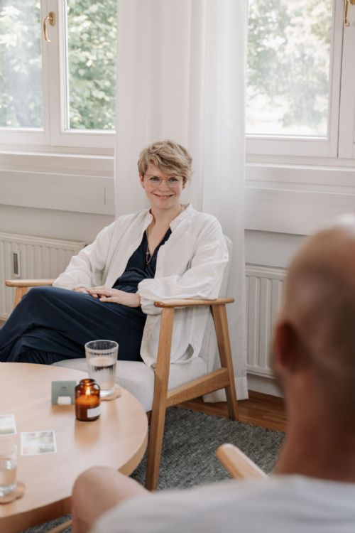 Arbeit sitzend mit Klientin in der psychotherapeutischen Sitzung kann man sich gegenübersitzend besprechen, oder Objekte aus dem Praxisraum werden mitgenutzt. Dadurch wird das Besprochene erlebbarer und zugänglicher in der Therapie.