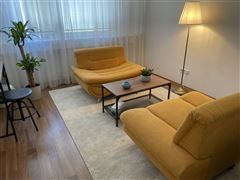 Praxisraum IIIDer Praxisraum wirkt einladend und gemütlich, mit einem klaren Fokus auf Wohlbefinden und Vertrautheit. Die Einrichtung kombiniert warme Gelbtöne der Sitzmöbel mit einem dezenten, modernen Stil. Ein zentral platzierter Couchtisch schafft eine angenehme Gesprächsatmosphäre. Die weichen Vorhänge lasse
