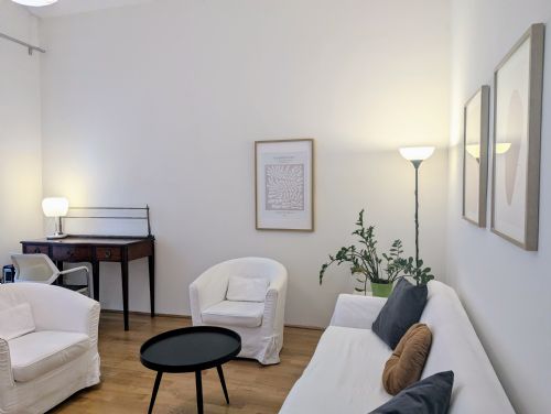 Unser großer heller Praxisraum in der Schwaigergasse 35. Gemütlich, klar, ruhig. Richtig gut geeignet zum intensiven Arbeiten.
