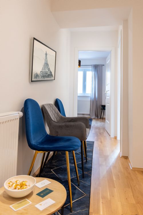Mir ist es ein Anliegen, dass Sie sich in meiner Praxis geschützt und wohl fühlen - ein sicherer Ort für Ihre Anliegen. Daher erwarten Sie großzügige, licht- und luftdurchflutete Räumlichkeiten.
