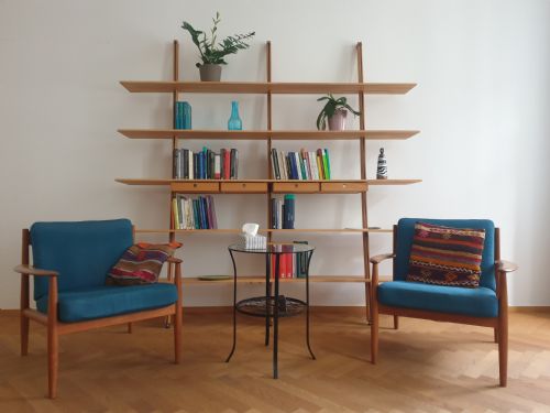 Gesamtansicht der Sitzgruppe im Praxisraum von Dr. Stephan Hametner. Der Raum kann verschieden ausgeleuchtet werden, der Blick durchs Fenster geht in einen wunderbaren Garten in Innenstadtlage. Das Setting ist je nach Bedarf veränderbar. Direkt vom Praxisraum aus kann ein separates WC besucht werden