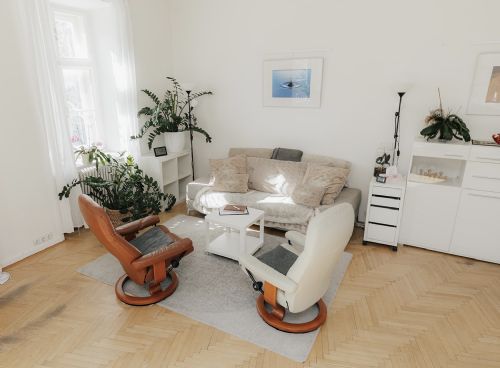 Unser großer heller Praxisraum in der Schwaigergasse 35. Gemütlich, klar, ruhig. Richtig gut geeignet zum intensiven Arbeiten.