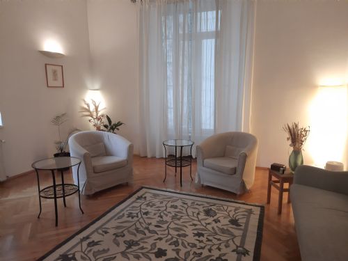 Gesamtansicht der Sitzgruppe im Praxisraum von Dr. Stephan Hametner. Der Raum kann verschieden ausgeleuchtet werden, der Blick durchs Fenster geht in einen wunderbaren Garten in Innenstadtlage. Das Setting ist je nach Bedarf veränderbar. Direkt vom Praxisraum aus kann ein separates WC besucht werden