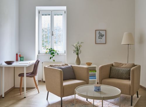Der Praxisraum vermittelt eine moderne und zugleich gemütliche Atmosphäre, die einladend und beruhigend wirkt. Die warmen Orangetöne der beiden Sessel schaffen eine angenehme, freundliche Umgebung, ideal für offene Gespräche und kreative Zusammenarbeit.