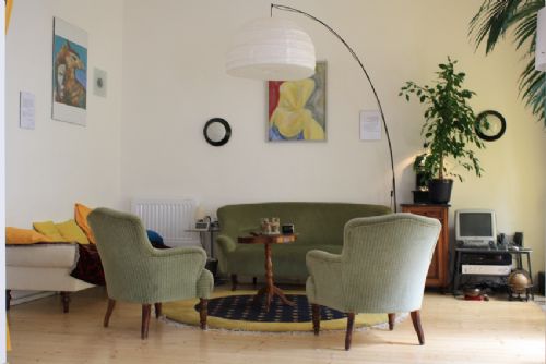 Im 30m2 großen Praxisraum gibt es ausreichend Platz für Psychotherapie im Sitzen, Gehen, für Bewegung und Kreativität.