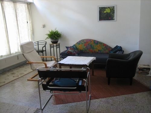In der Regel nehmen die Klienten auf diesem Sessel Platz, auf Wunsch oder je nach Bedarf aber gerne auch in jeder anderen Richtung. Der Blick geht von diesem Sessel hinaus in den Garten.