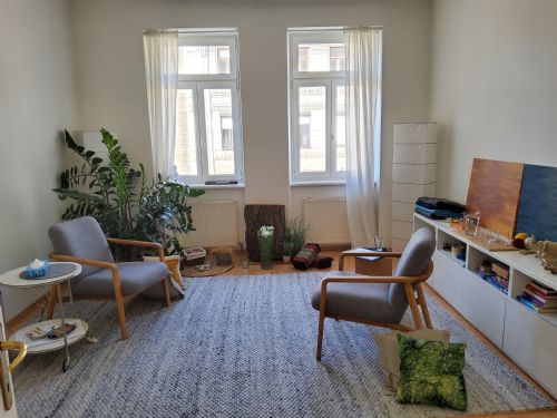 PraxisraumDer angenehm helle Praxisraum, ruhig im 3. Stock gelegen, angenehme Altbau-Höhe, hier lässt es sich gut und sicher mit Einzelpersonen, Paaren, kleineren Teams und Gruppen arbeiten.