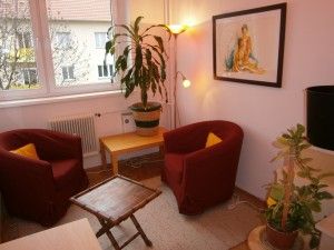 Gemütlicher, heller Gesprächsraum mit Wohnzimmeratmosphäre in der Lichtblickpraxis - mit Blick auf den Plabutsch.