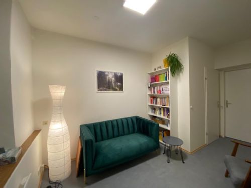 Der Praxisraum wirkt einladend und gemütlich, mit einem klaren Fokus auf Wohlbefinden und Vertrautheit. Die Einrichtung kombiniert warme Gelbtöne der Sitzmöbel mit einem dezenten, modernen Stil. Ein zentral platzierter Couchtisch schafft eine angenehme Gesprächsatmosphäre. Die weichen Vorhänge lasse
