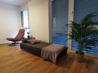 Der Praxisraum vermittelt eine moderne und zugleich gemütliche Atmosphäre, die einladend und beruhigend wirkt. Die warmen Orangetöne der beiden Sessel schaffen eine angenehme, freundliche Umgebung, ideal für offene Gespräche und kreative Zusammenarbeit.