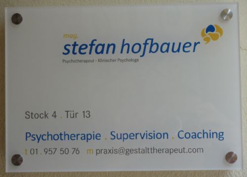 Praxisschild Mag. Stefan Hofbauer, Psychotherapeut, Klinischer & Gesundheitspsychologe, Göllnergasse 8, 1030 Wien.