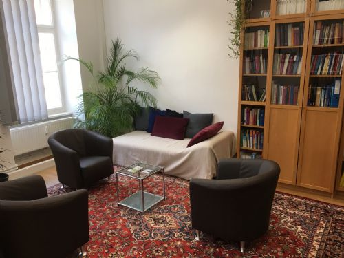 Der Praxisraum strahlt eine warme, einladende und professionelle Atmosphäre aus. Die Kombination aus braunen Ohrensesseln, einem orangenen Akzentstuhl und vielfältigen Pflanzen verleiht dem Raum eine gemütliche und natürliche Ausstrahlung.