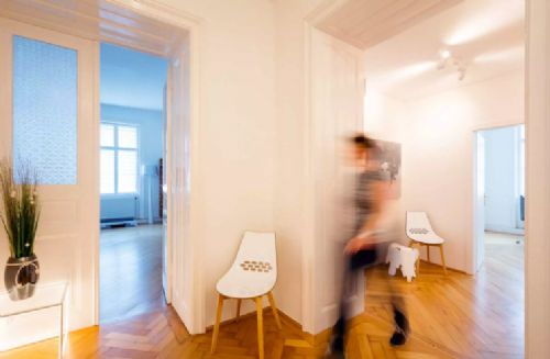 Der angenehm helle Praxisraum, ruhig im 3. Stock gelegen, angenehme Altbau-Höhe, hier lässt es sich gut und sicher mit Einzelpersonen, Paaren, kleineren Teams und Gruppen arbeiten.