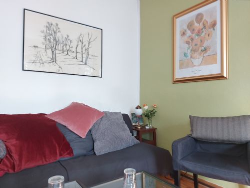 Der Praxisraum wirkt einladend und gemütlich, mit einem klaren Fokus auf Wohlbefinden und Vertrautheit. Die Einrichtung kombiniert warme Gelbtöne der Sitzmöbel mit einem dezenten, modernen Stil. Ein zentral platzierter Couchtisch schafft eine angenehme Gesprächsatmosphäre. Die weichen Vorhänge lasse