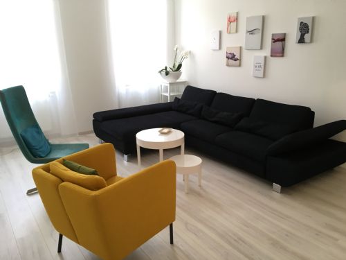 Praxisraum 1 ist mit Besprechungstisch, Liegecouch bzw. Sitzecke eingerichtet. Er eignet sich für Einzeltherapie, Paartherapie, Coaching, Training, Supervision und Kleingruppen bis zu 4-5 Personen.